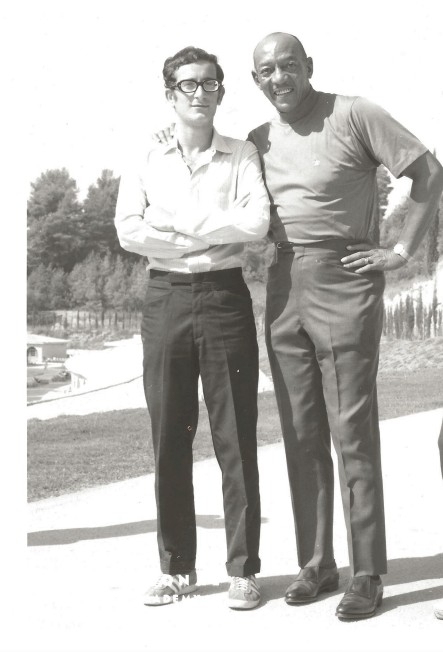 Lui era Jesse Owens (1913-1980), vincitore a Berlino nel 1936 di quattro medaglie d’oro (100 e 200 metri, salto in lungo e staffetta 4x100 metri). Anche a me raccontò che era falsa la storia dell’ostilità manifestatagli da Hitler dopo la sua vittoria sull’atleta tedesco Luz Long, lunghista anch’egli ed amico di Jesse, cui quest’ultimo aveva dato importanti consigli in allenamento (così mi disse, in specie sui passi finali della rincorsa), nei giorni dei Giochi di Berlino. Aveva anche chiesto, allora, Owens con già tre medaglie d’oro al collo, di essere esonerato dalla staffetta americana che era favorita, perché vi fosse potesse gareggiare una riserva e potesse così vincere una medaglia. I dirigenti non vollero e schierarono Owens. Quello e quell’altro comportamento ancora e credo molti altri, tutto ciò fu vero fair play. Owens lo mostrò in tutta la vita, anche con me, ragazzino che non liquidò in poche battute e si fece invece coinvolgere e si spese per dirmi e darmi. Scrissi poi un articoletto che non ho mai pubblicato e che conservo e che si intitola: “Ti vengo a cercare.” Credo mi disse cose che ad altri non aveva ancora detto. Mi fece sentire uno al quale si dovevano dire speciali parole perché le portasse con sé nel futuro e le consegnasse a chi veniva dopo. Una foto che ci ritrae insieme è uno dei ricordi più cari di quegli anni.